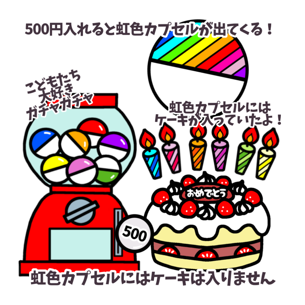(ケーキは虹色カプセルよりも大きいので裏表にはなりません)